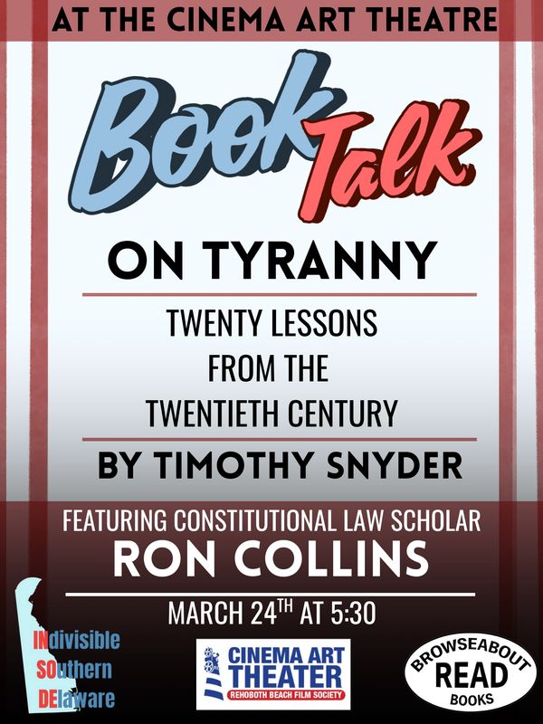 Indivisible Southern Delaware, in partnership with the Rehoboth Beach Film Society's Cinema Art Theater and Browseabout Books, is proud to present a special Book Talk on On Tyranny: Twenty Lessons from the Twentieth Century by Timothy Snyder.