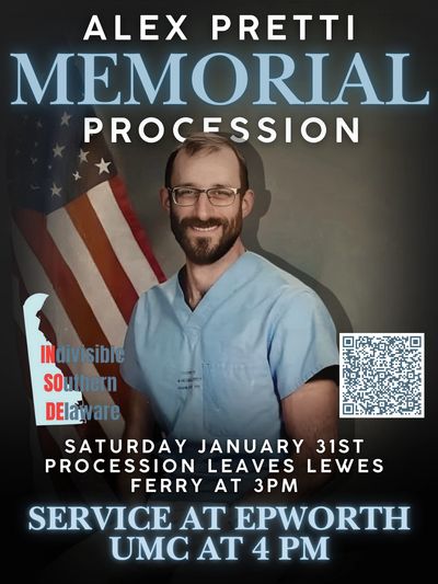 Due to the insufficiently cleared, icy and dangerous areas where our sign waves normally take place on Saturdays, Indivisible is instead asking all members to join us for a Memorial procession and service of reflection and connection for Alex Pretti. We will begin in Lewes at the Cape May Ferry parking area. We will be lining up starting at 2:30 with a 3:00 departure from that lot. The procession will go from Lewes through Rehoboth and Dewey and turning around at Tower Road. We will then head through Rehoboth and back out to Route 1 where we will go to Epworth. We will be having a memorial service at Epworth United Methodist Church at 4:00 pm.
