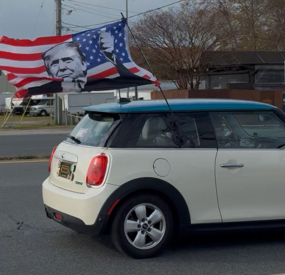 11/15/25 - Female passenger thinks Trump is her daddy and her president. Part of caravan with mini Cooper in tow.